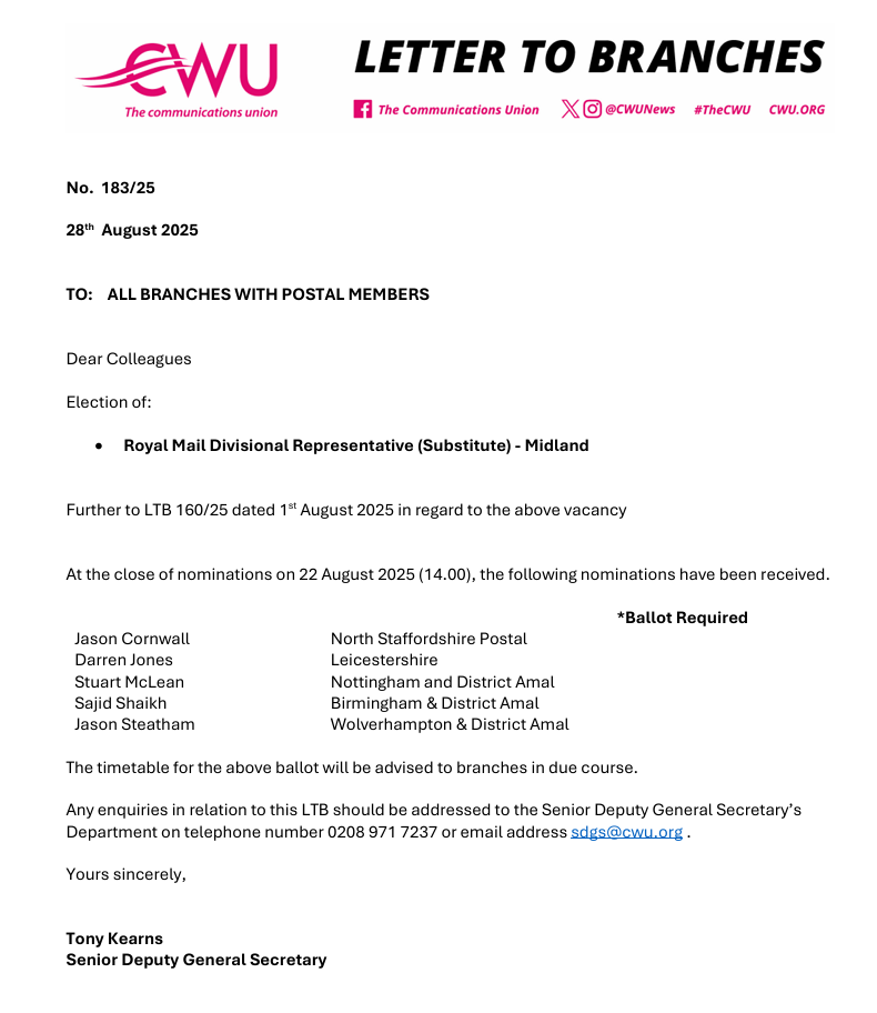 Letter to branches, Election of Royal Mail Divisional Representative (Substitute) Midlands